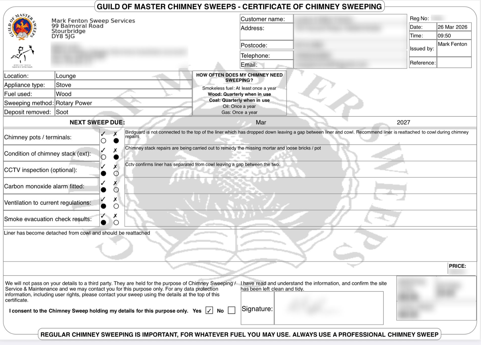 Upon completion of a successful sweep I will issue an insurance industry recognised certificate to satisfy your home insurance provider. Certificates are issued electronically via email.
